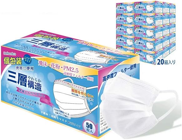 amazon 個包装マスク 不織布マスク 使い捨てマスク 3層構造 プリーツタイプ 50枚箱入り fines 家庭用マスク