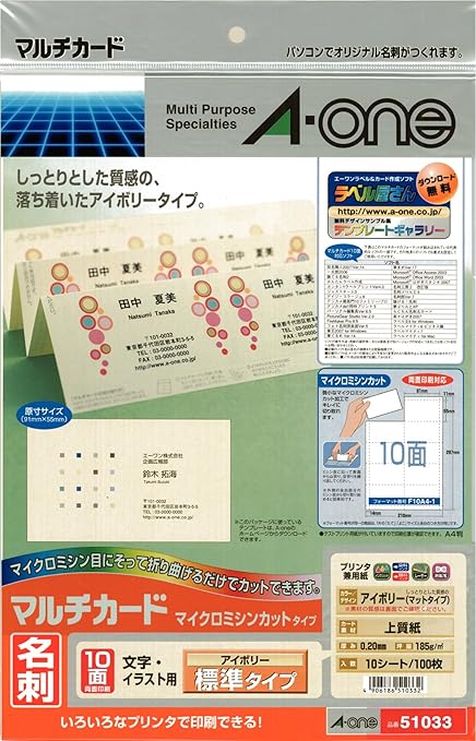 エーワン マルチカード 名刺用紙 両面 クリアエッジ アイボリー フチまで印刷 100枚分 51691