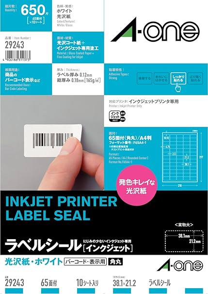 エーワン ラベルシール インクジェット 光沢紙 a4 65面 10シート 29243