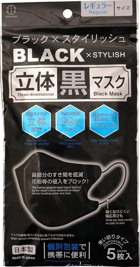 小久保工業所 立体黒マスク 個包装 5枚入り 立体型 花粉 pm2 5対応 レギュラーサイズ 日本製 痛くなりにくい 使い捨て ブラック
