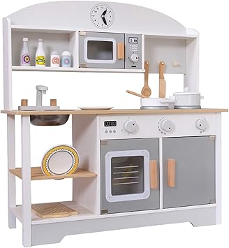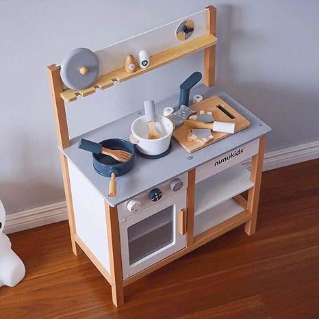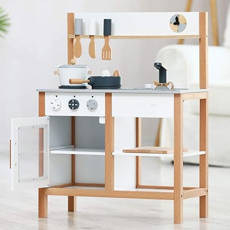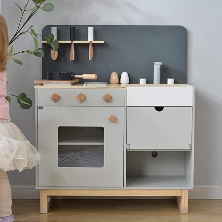 amazon おままごとキッチン 木製 誕生日 台所 調理器具付 食材 知育玩具 コンロ ミニキッチン おもちゃキッチン グレー セット おもちゃ