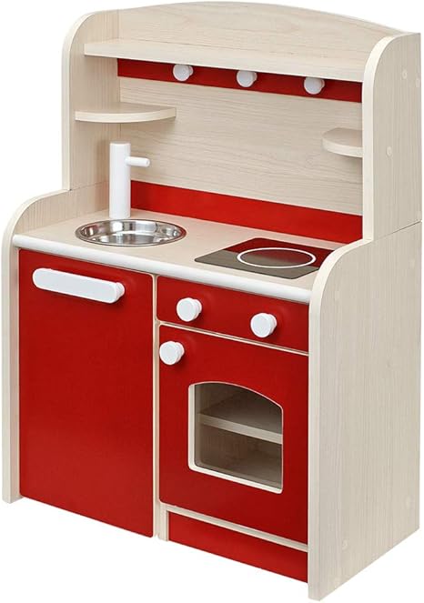 rizkiz おままごとキッチン おもちゃ レッド ステンレス製 ミニチュアキッチンお鍋セット 幅55cmx奥行き35cmx高さ80cm 木製 収納付き 安心安全設計 子供用 組立式