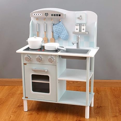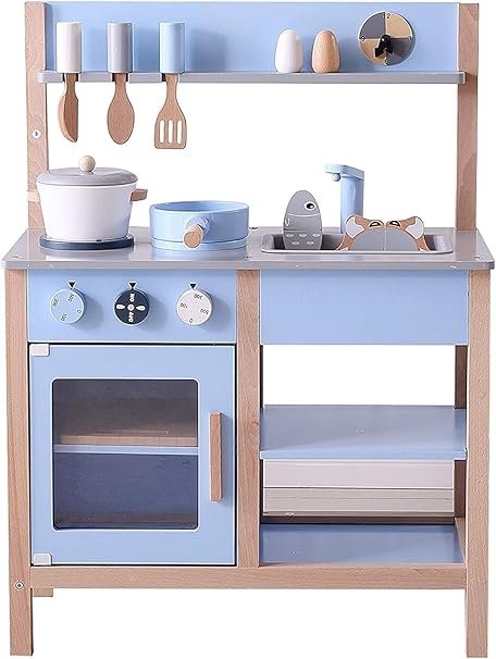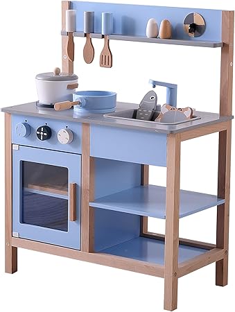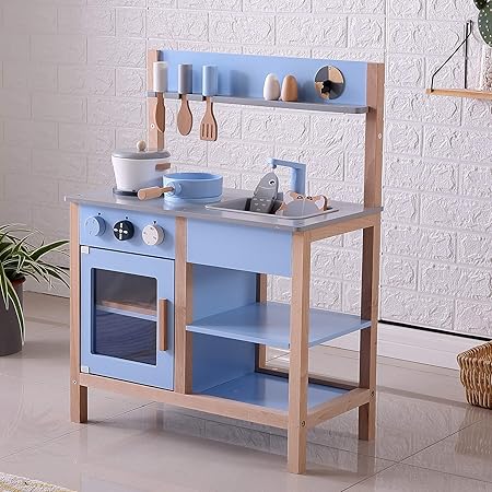 amazon allead おままごとキッチン 木製 自信作 誕生日 台所 付属あり 調理器具 調味料 食材 知育玩具 コンロミニキッチン おもちゃキッチン ブルー セット おもちゃ