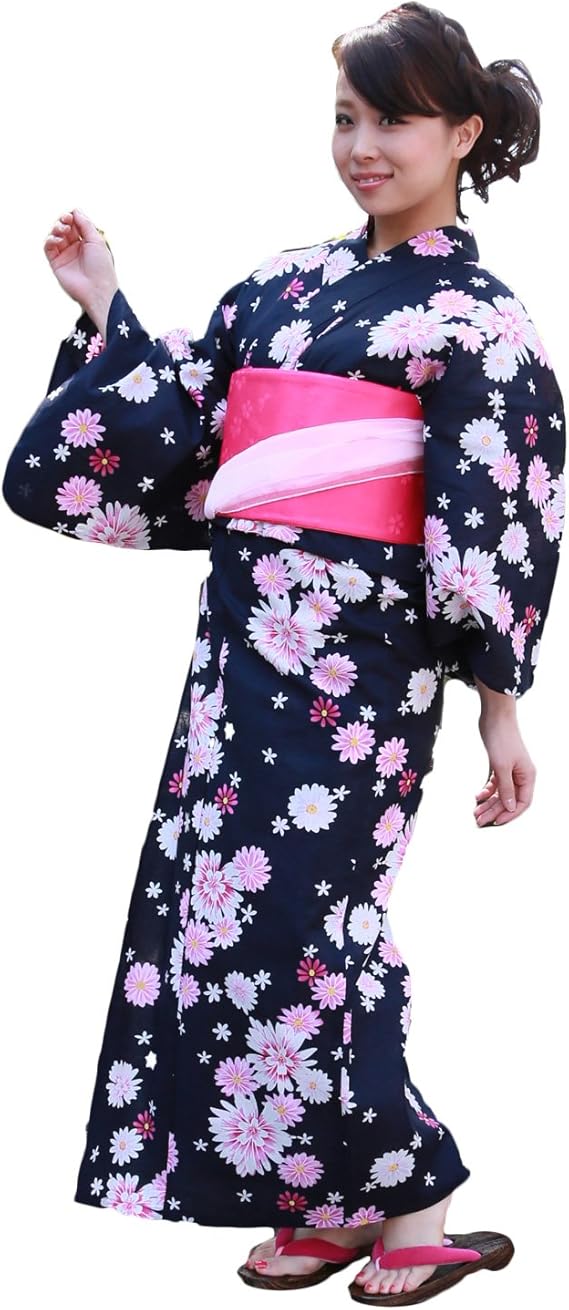 amazon 浴衣 レディース セット 作り帯 紺地にピンク 紫の花輪 ときめき夏恋浴衣作り帯3点セット 浴衣 作り帯 下駄 浴衣 通販