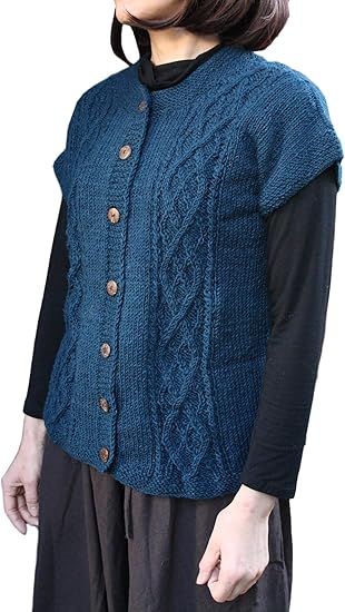 amazon raksa ラクサ 手編み ニット ベスト ウール100 ケーブル編み 前開き 丸首 ブルー ベスト 通販