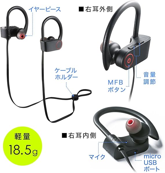 amazon サンワダイレクト bluetooth イヤホン 防水 両耳 2種 3サイズのイヤーピース スポーツ 2台同時待受 400 btsh009 家電 カメラ