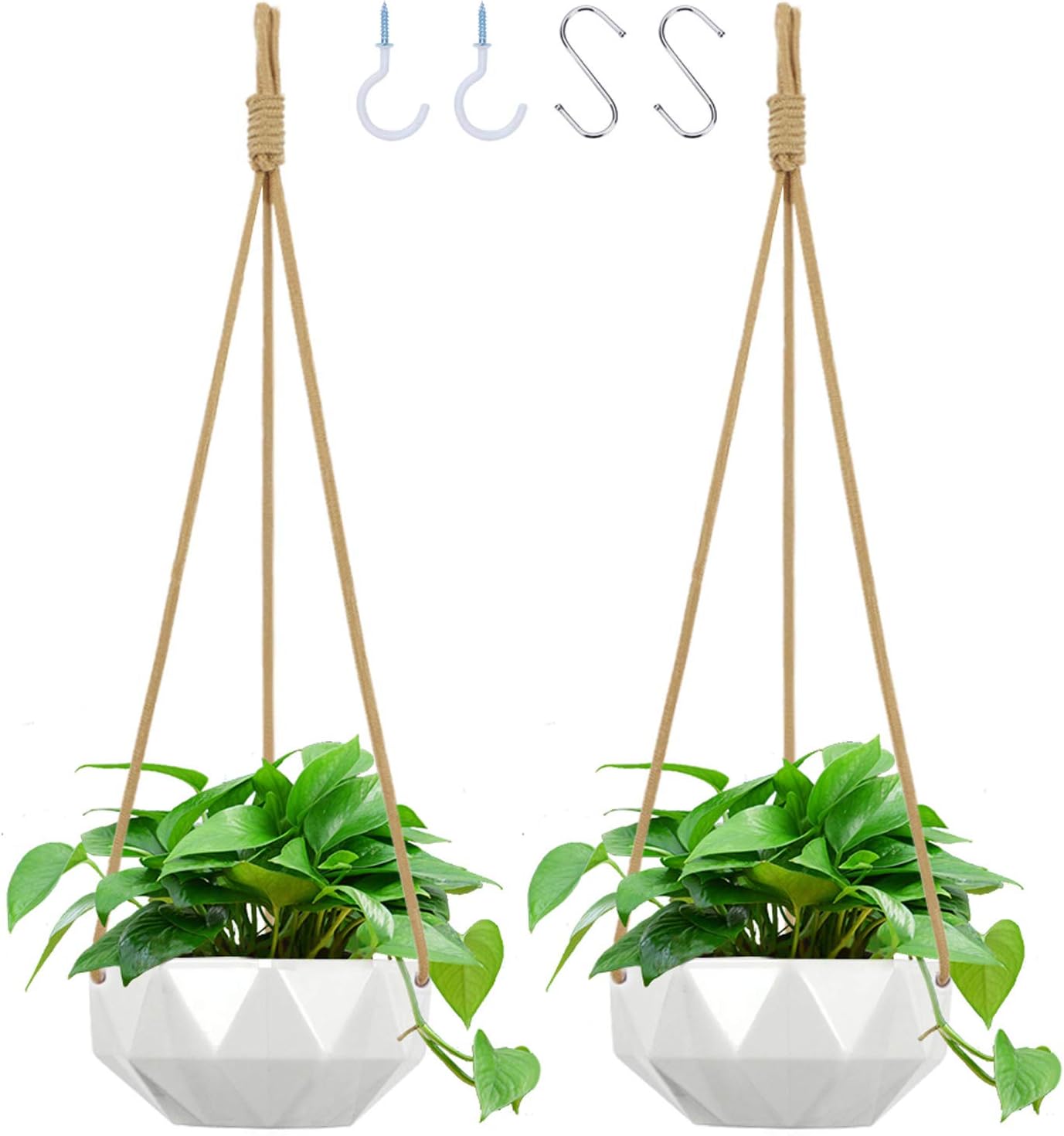 growneer 2パック 8インチ セラミック ハンギングプランター フック4個付き ホワイト磁器 幾何学模様 壁掛け植物ホルダー フラワーポット ナイロンロープ付き ホームデコレーション ギフト ガーデン インドア アウトドア用
