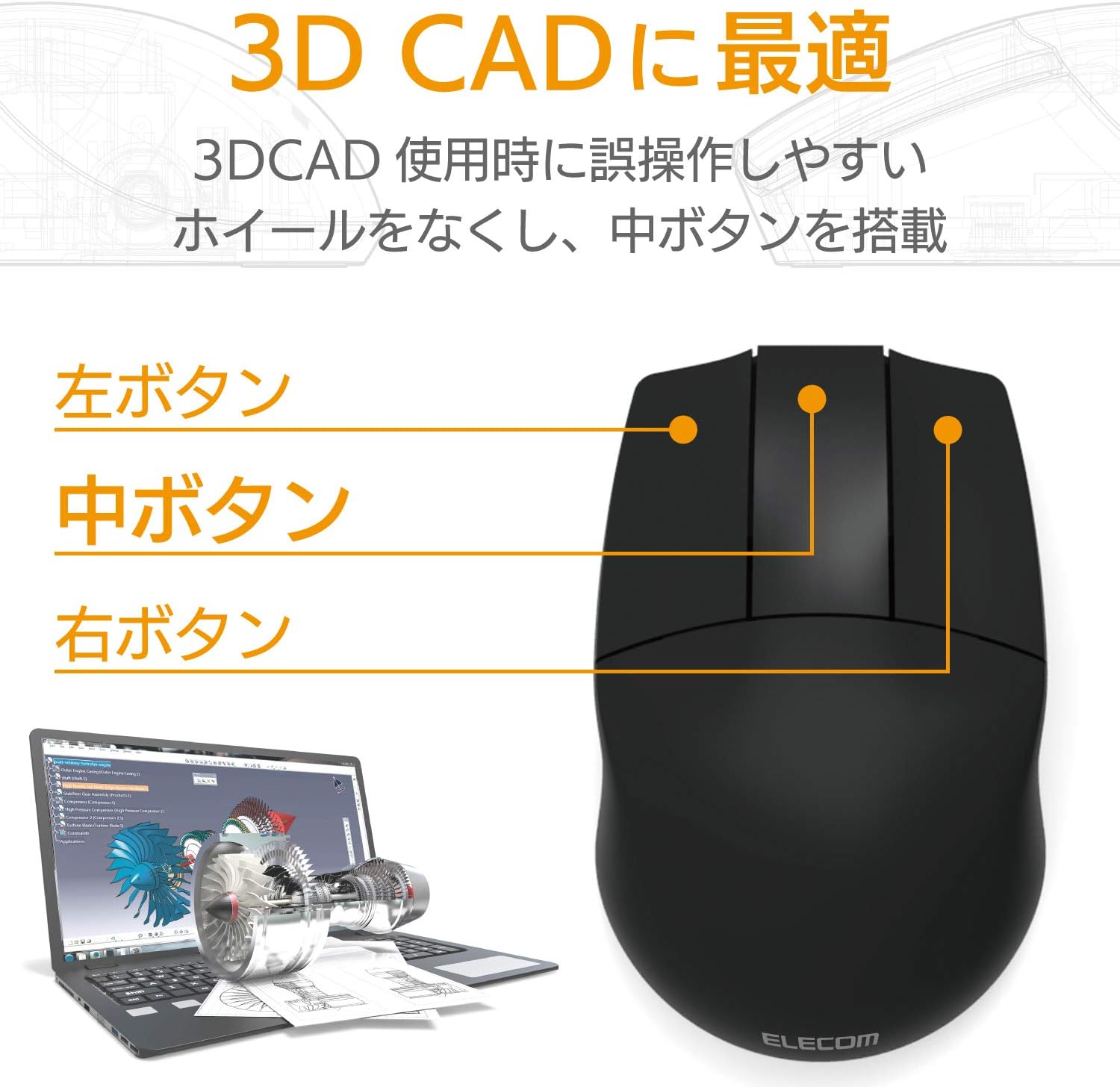エレコム マウス ワイヤレス レシーバー付属 mサイズ cad向け 3ボタン ホイールレス 左右対称 600 1200カウント2段階調整 ブラック m cad01dbbk エレコム パソコン 周辺機器 通販 amazon