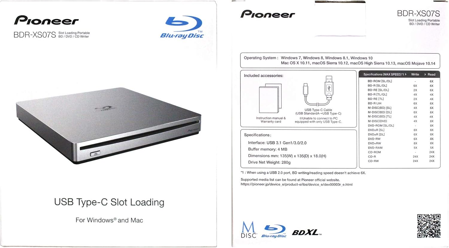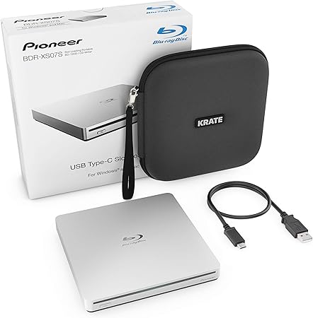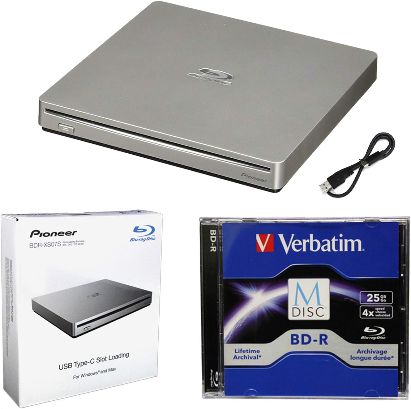 pioneer bdr xs07s portable 6x blu ray burner external drive bundle with 25gb m disc bd r and usb cable burns cd dvd bd dl bdxl discs