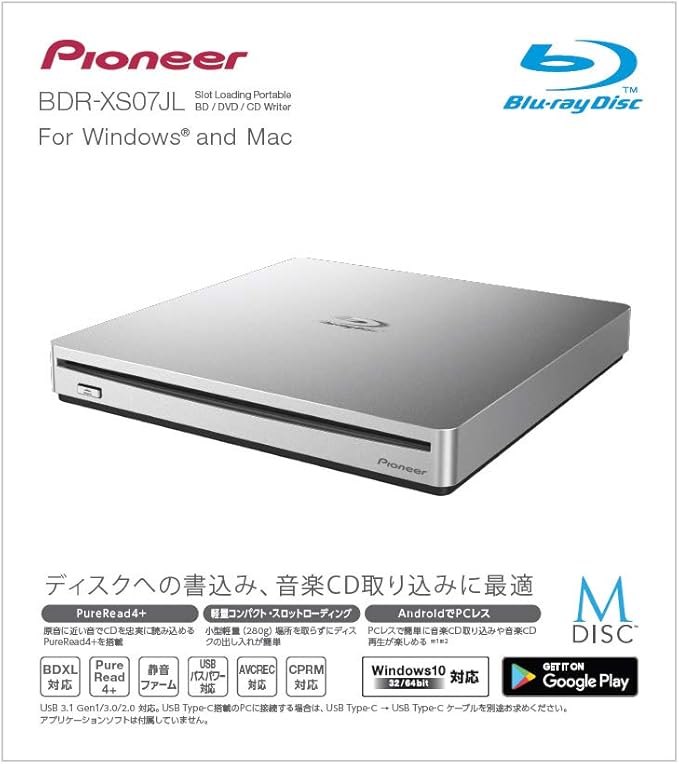 pioneer パイオニア スロットインタイプ ポータブルブルーレイドライブ for win mac ソフト無モデル シルバー bdr xs07jl