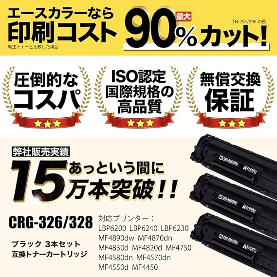amazon エースカラー キヤノン crg 326 328 3本セット 互換 トナーカートリッジ326 328 対応プリンター canon lbp6200 lbp6240 lbp6230 mf4580dn mf4570dn mf4550d mf4450 mf4430 mf4420n mf4410 mf4750 mf4820d mf4830d mf4870dn mf4890dw キヤノフアクスl250