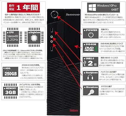 中古パソコン windows10 デスクトップ 一年保証 lenovo thinkcentre a58 7522 celeron 450 2 2ghz 3gb 250gb win10pro32bit 中古pc